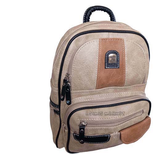 Τσάντα πλάτης- backpack κλείνει με φερμουάρ και έχει ενιαίο εσωτερικό χώρο.Διαθέτει εσωτερική τσέπη με φερμουάρ και θήκη για κινητό.Έχει τρείς εξωτερικές θήκες με φερμουάρ και μία με κούμπωμα στην μπροστινή πλευρά . Στα πλαινά μέρη διαθέτει δύο θήκες με φερμουάρ. Το εσωτερικό της ειναι επενδεδυμένο με φόδρα.